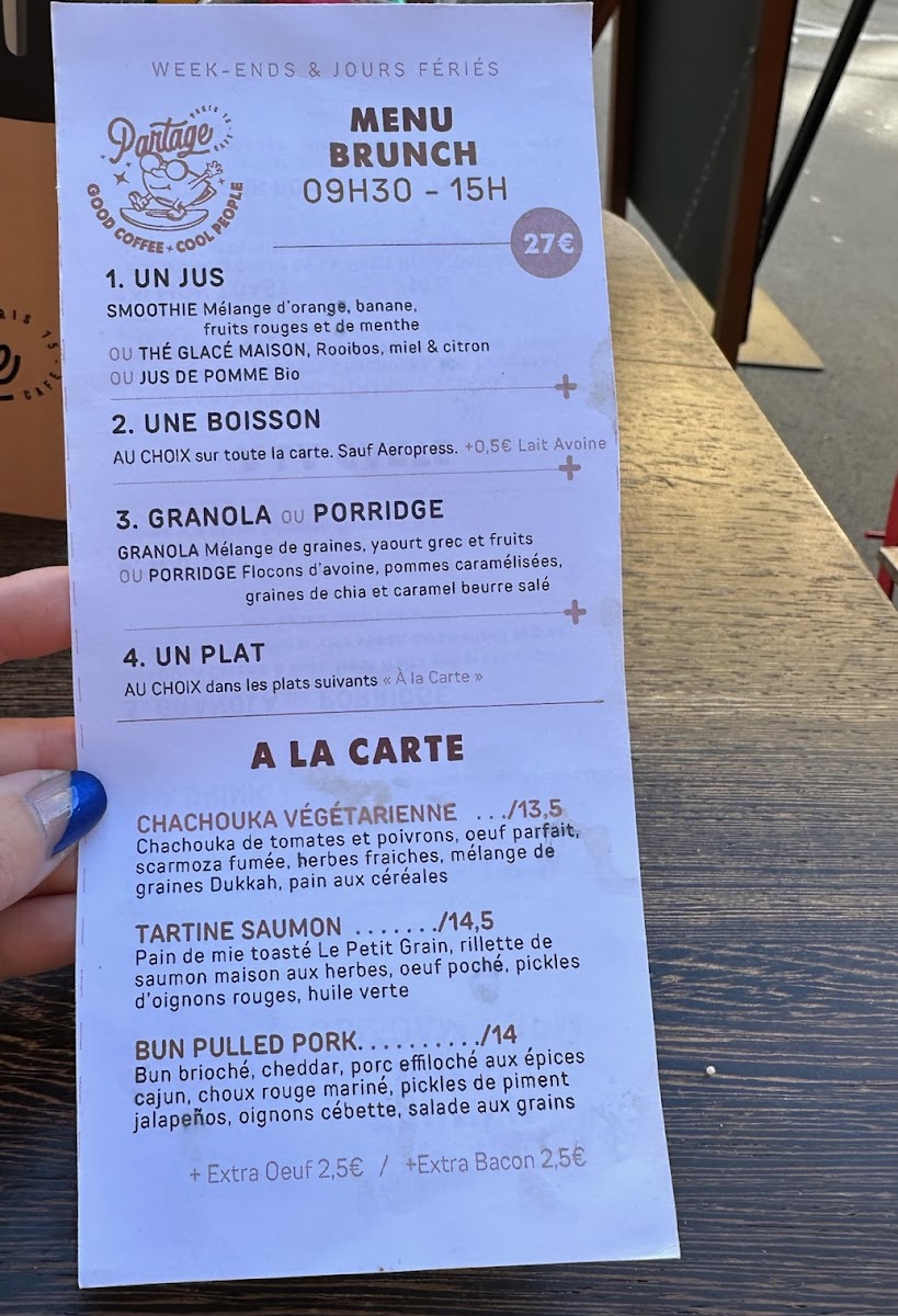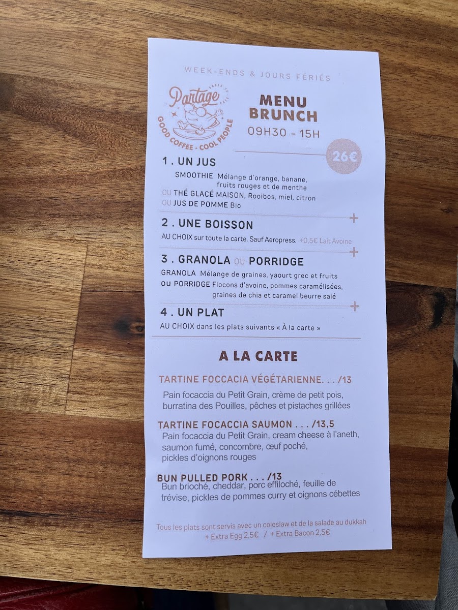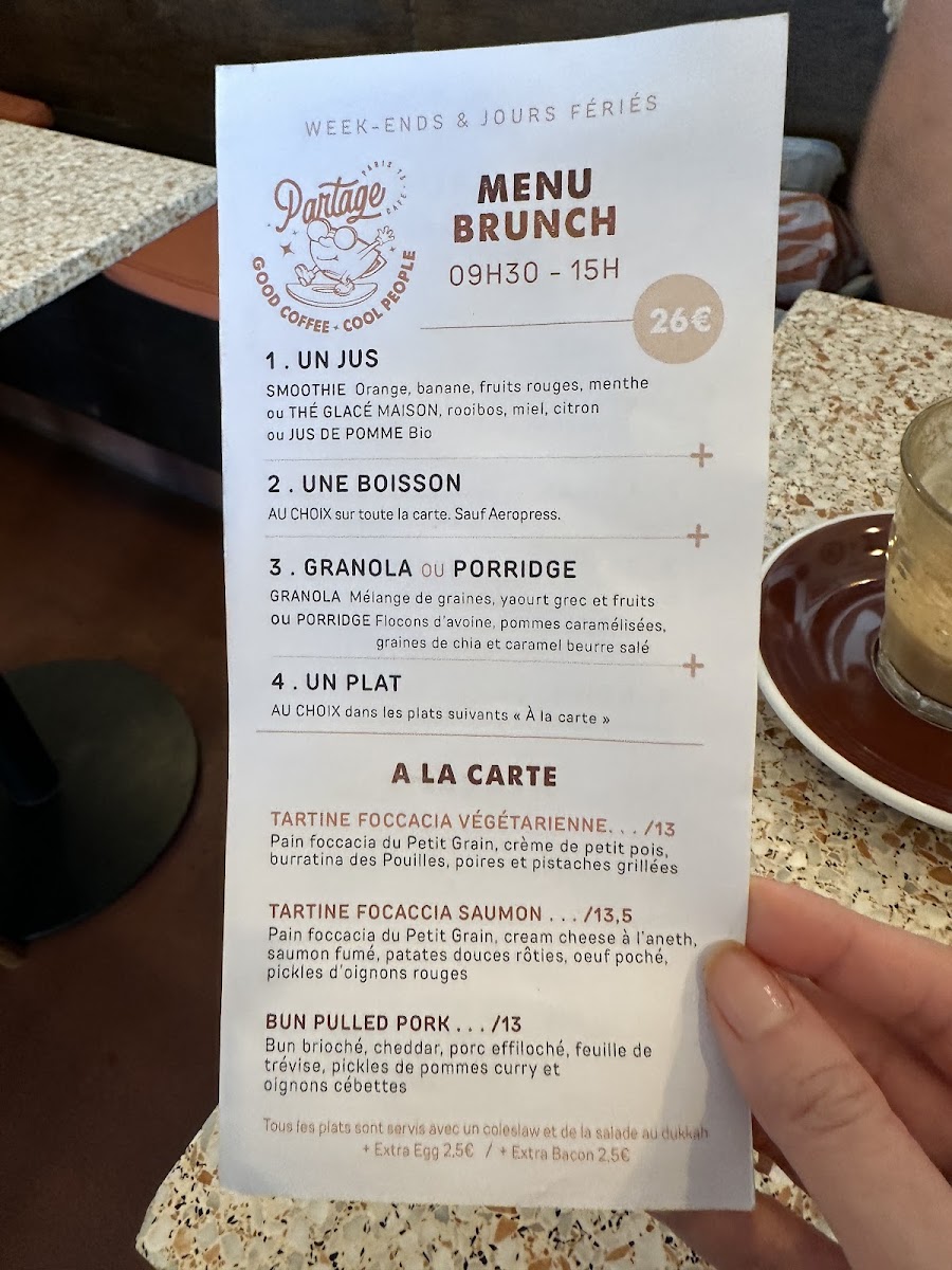 Nestled in the heart of Paris, Partage Café offers an inviting menu that artfully blends brunch classics with fresh, healthy options. The café excels in vegetarian dishes, satisfying diners with vibrant flavors and wholesome ingredients. Highlights include perfectly cooked eggs, an exquisite carrot cake praised by locals, and a variety of well-balanced platters that come with juice and coffee, creating a fulfilling brunch experience. The menu also caters thoughtfully to diverse preferences, featuring oat milk and energy cups that complement the rich, smooth moccachino and delightful desserts.